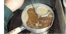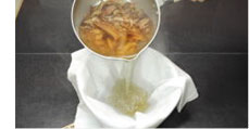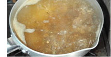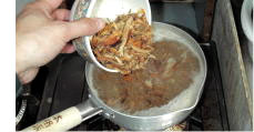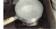 『水』が沸騰したところへ、温度を下げないように『だし』を入れ、鍋の中を平均にぐるぐる回るくらいの火加減にして、丁寧に『アク』を取りながら約10分間煮出して下さい。 (注意 途中で水を足さないで下さい。)